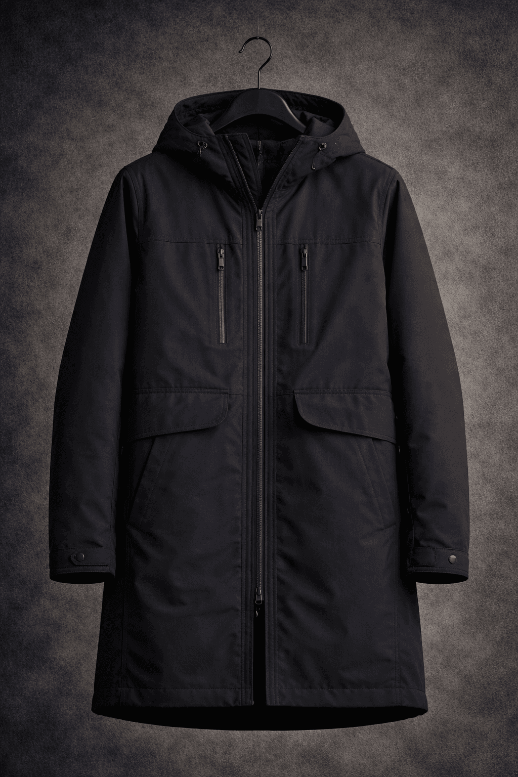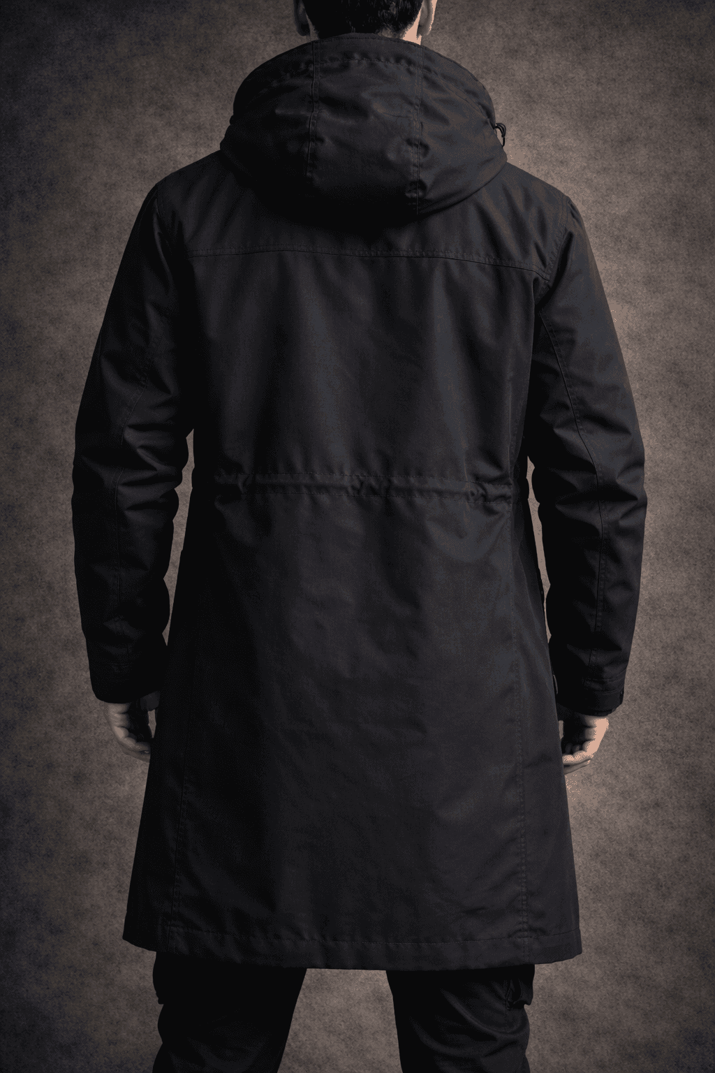 Designed to create a sharp, controlled silhouette, it extends below the waist for additional protection while maintaining mobility. A refined essential for colder conditions within an urban setting.